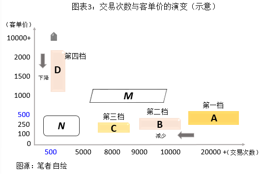 參見圖三,縱觀客單價和交易次數(shù)相關性,第一檔穩(wěn)定發(fā)展,第二檔客流略有下降、交易次數(shù)保持穩(wěn)定,第三檔總體相對穩(wěn)定,綜合價值跌落最顯著的便是傳統(tǒng)百貨店。