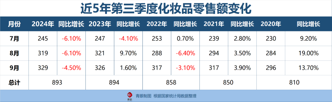 事實(shí)上,國(guó)內(nèi)頭部美妝上市公司在第三季度集體下滑的背后,實(shí)則反映了當(dāng)下國(guó)內(nèi)美妝市場(chǎng)的“寒氣十足”。根據(jù)國(guó)家統(tǒng)計(jì)局發(fā)布數(shù)據(jù)顯示,今年7月至9月,化妝品零售額分別為245億元、319億元、329億元,分別同比下滑-6.1%、-6.1%、-4.5%。