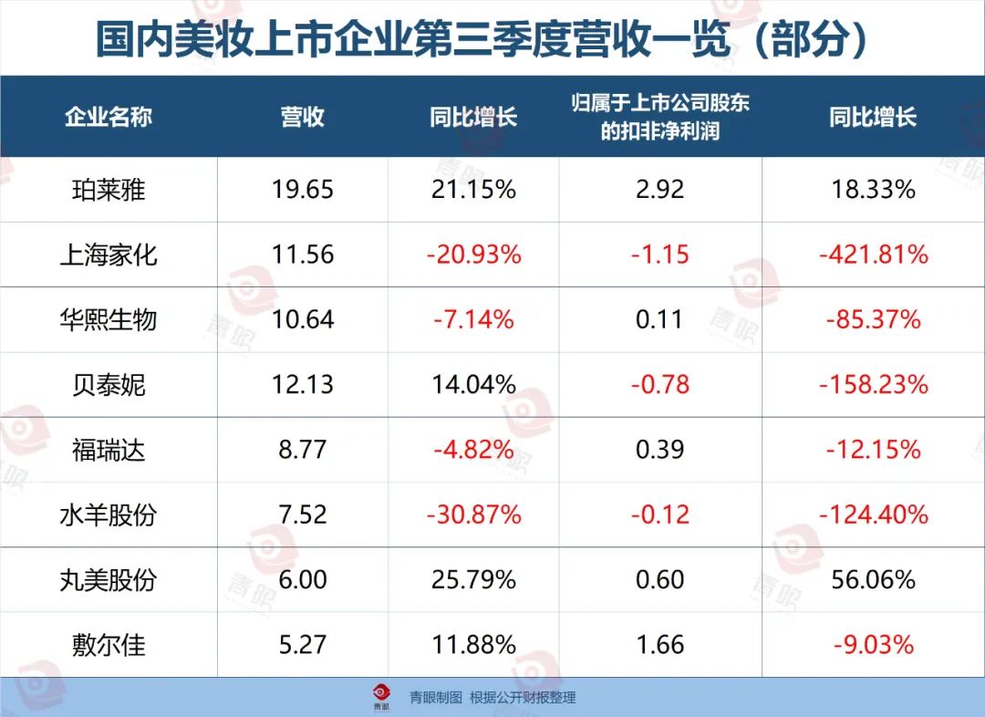 一方面,是大盤(pán)史無(wú)前例的連續(xù)下跌。根據(jù)國(guó)家統(tǒng)計(jì)局?jǐn)?shù)據(jù),從今年6月起,化妝品類(lèi)零售額已出現(xiàn)罕見(jiàn)的“四連跌”,可謂頹勢(shì)連連。另一方面,國(guó)內(nèi)頭部上市美妝公司業(yè)績(jī)也不再“堅(jiān)挺”。根據(jù)青眼梳理,已發(fā)布財(cái)報(bào)的8家美妝上市企業(yè)中,有6家扣非歸母凈利潤(rùn)為負(fù)增長(zhǎng),最大跌幅高達(dá)421.81%,與此同時(shí),半數(shù)企業(yè)營(yíng)收同比均出現(xiàn)下滑,跌幅高至30.87%。
