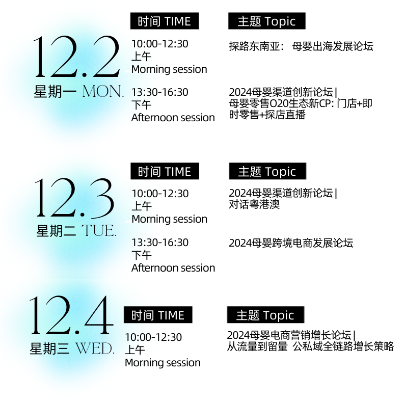 知識(shí)分享和靈感碰撞作為展會(huì)的活動(dòng)宗旨之一,同期論壇是每屆必不可少的亮點(diǎn)。2024年CBME GBA大灣區(qū)孕嬰童展同期設(shè)有五場(chǎng)主題論壇,圍繞“出海東南亞”、“母嬰O2O零售創(chuàng)新”、“母嬰跨境電商”、“粵港澳渠道戰(zhàn)略”、“母嬰公私域全鏈路增長(zhǎng)”等議題深入展開,將來自頭部平臺(tái)、營(yíng)銷、零售端等行業(yè)大咖共聚一堂分享趨勢(shì)和創(chuàng)新想法,通過面對(duì)面的聆聽和交流,共尋商業(yè)新思路。
