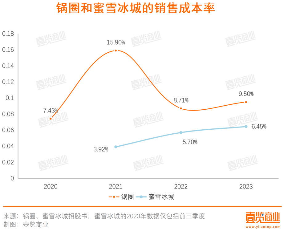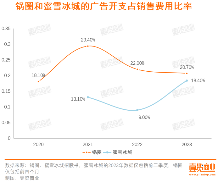 在銷售成本中,廣告及推廣開支占據(jù)大頭。2021年—2023年前三季度,蜜雪冰城廣告及推廣成本占銷售成本的13.1%、9%、18.4%;而鍋圈2020年—2023年前四個(gè)月廣告及推廣成本占銷售成本的18.1%、29.4%、22%、20.7%,后者在廣告上的投入明顯高于前者。