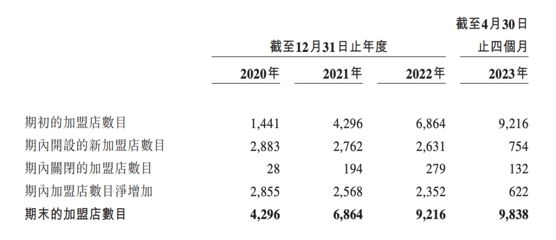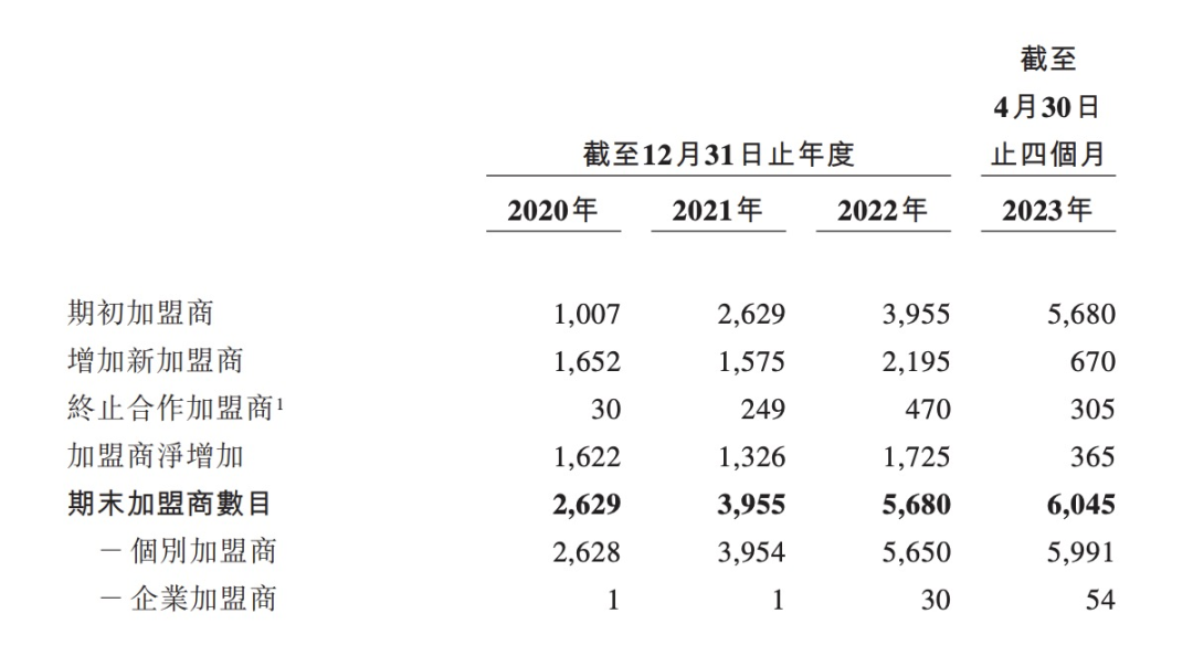 2020年,終止合作的加盟商30位,2021年激增至249位,2022年,這一趨勢并未得到遏制,反而繼續(xù)“高速增長”,終止合作的加盟商數(shù)量達(dá)到了470位。更令人擔(dān)憂的是,僅2023年前四個(gè)月,與公司終止合作的加盟商就已超過300位,月均增速超90%。
