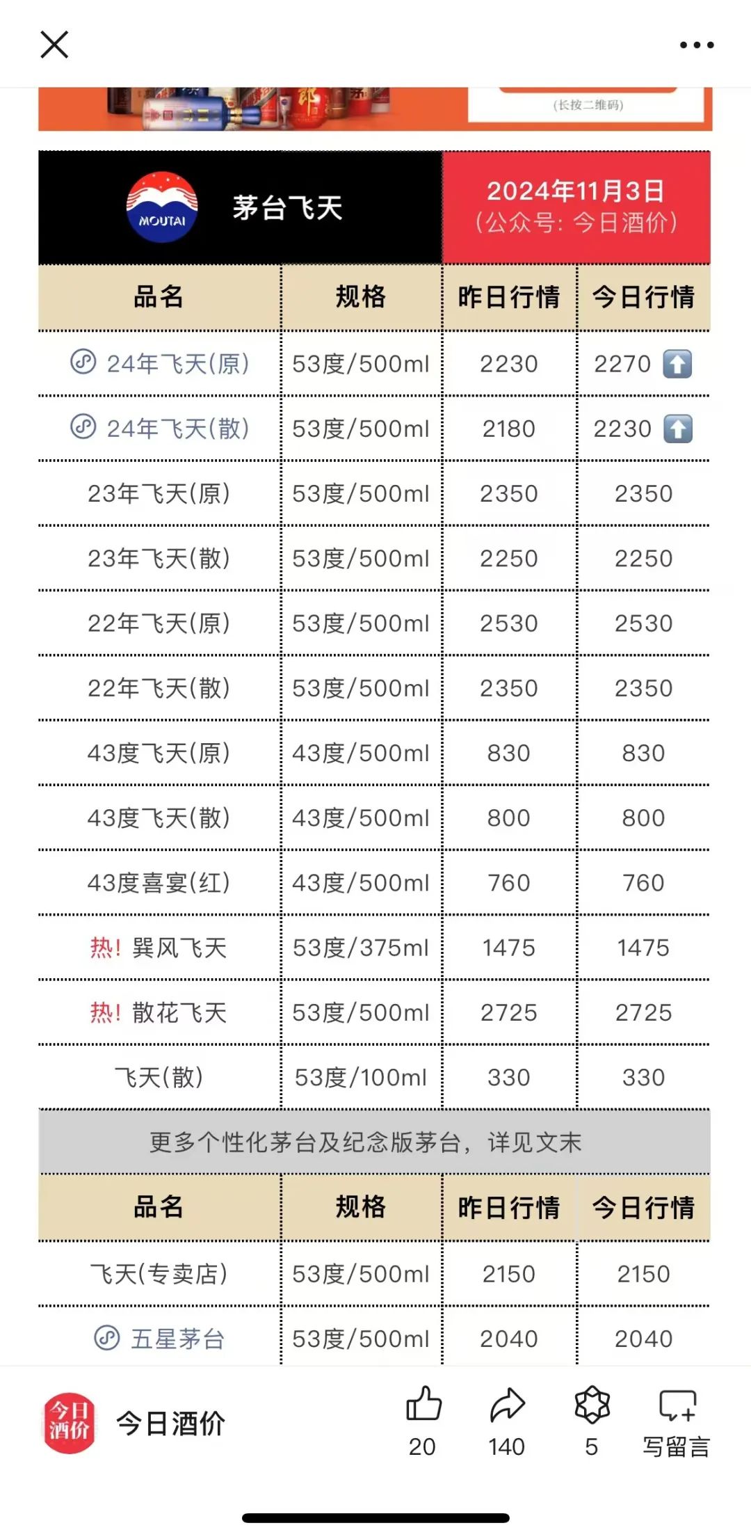 事實(shí)上,除了電商平臺(tái)價(jià)格走低,近期飛天茅臺(tái)的批發(fā)價(jià)卻有所上升!督袢站苾r(jià)》披露的批發(fā)參考價(jià)顯示,11月3日,2024年飛天茅臺(tái)原箱報(bào)價(jià)為2270元/瓶,較前一日上漲40元/瓶;散裝報(bào)價(jià)為2230元/瓶,較前一日上漲50元/瓶。