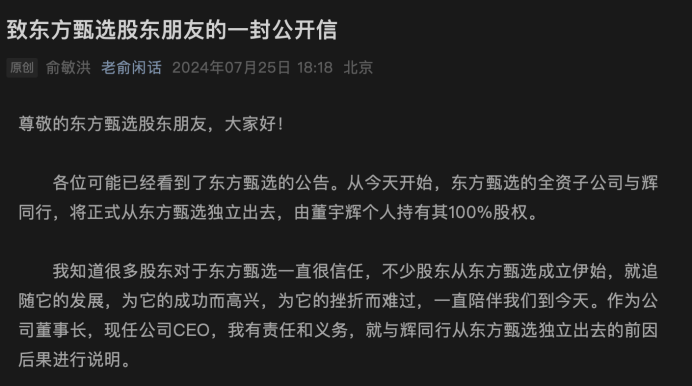 2024年7月25日晚,東方甄選在港交所發(fā)布公告,稱董宇輝已決定不再擔(dān)任公司雇員及公司一個(gè)合并聯(lián)屬實(shí)體的高級(jí)管理層,當(dāng)日生效。