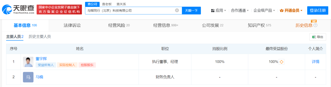 自此,與輝同行開始慢慢剝離東方甄選的痕跡。天眼查顯示,8月7日北京新東方迅程網(wǎng)絡(luò)科技有限公司從與輝同行(北京)科技有限公司的股東中退出,董宇輝變?yōu)楣緦?shí)際控制人,俞敏洪卸任公司監(jiān)事。9月3日,原東方甄選系的財(cái)務(wù)負(fù)責(zé)人王杰琳退出,由馬楠接任。