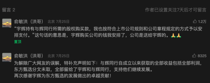 或許是為了避免紛爭(zhēng),當(dāng)晚俞敏洪在個(gè)人公眾號(hào)上用通俗的語(yǔ)言對(duì)此進(jìn)行了回應(yīng)與說(shuō)明,并在文章下補(bǔ)充了兩條評(píng)論: