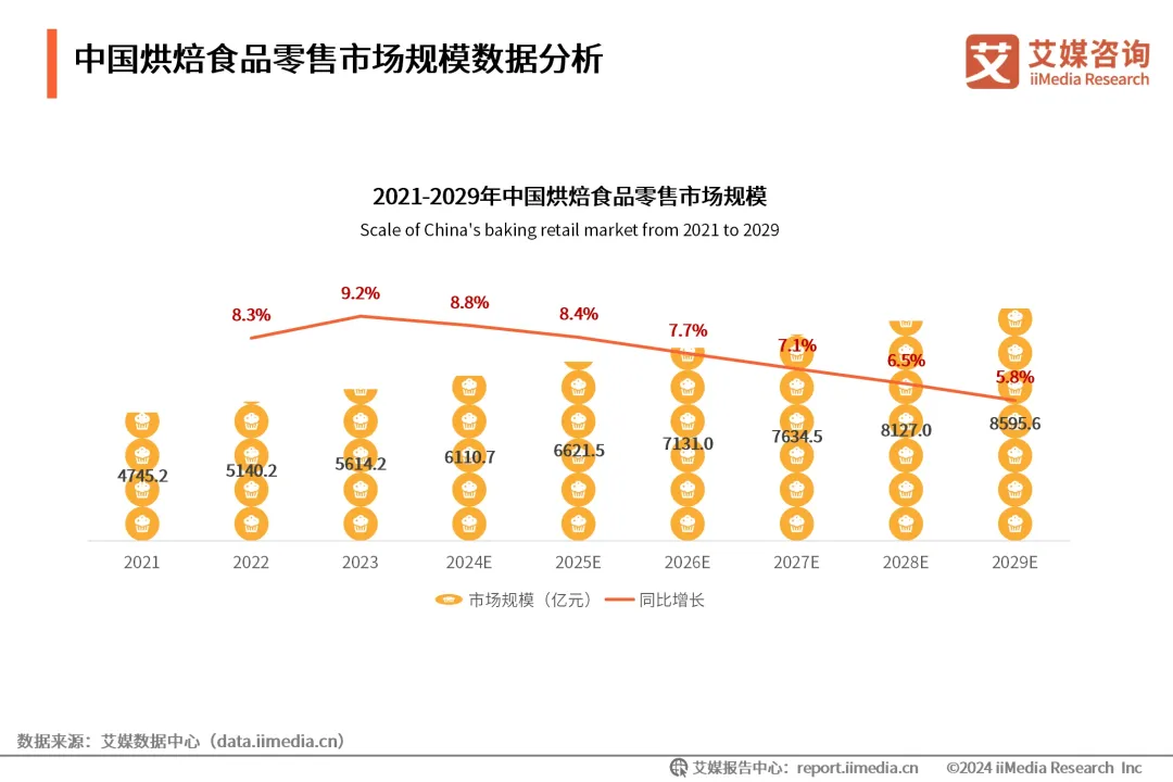據(jù)艾媒咨詢數(shù)據(jù)顯示,2023年我國烘焙食品零售市場(chǎng)規(guī)模為5614.2億,同比增長9.2%,隨著市場(chǎng)的進(jìn)一步擴(kuò)容,預(yù)計(jì)到2029年市場(chǎng)規(guī)模將會(huì)達(dá)到8595.6億。與此同時(shí)還有數(shù)據(jù)表明,有超過90%的消費(fèi)者每周都會(huì)購買至少一次烘焙食品。