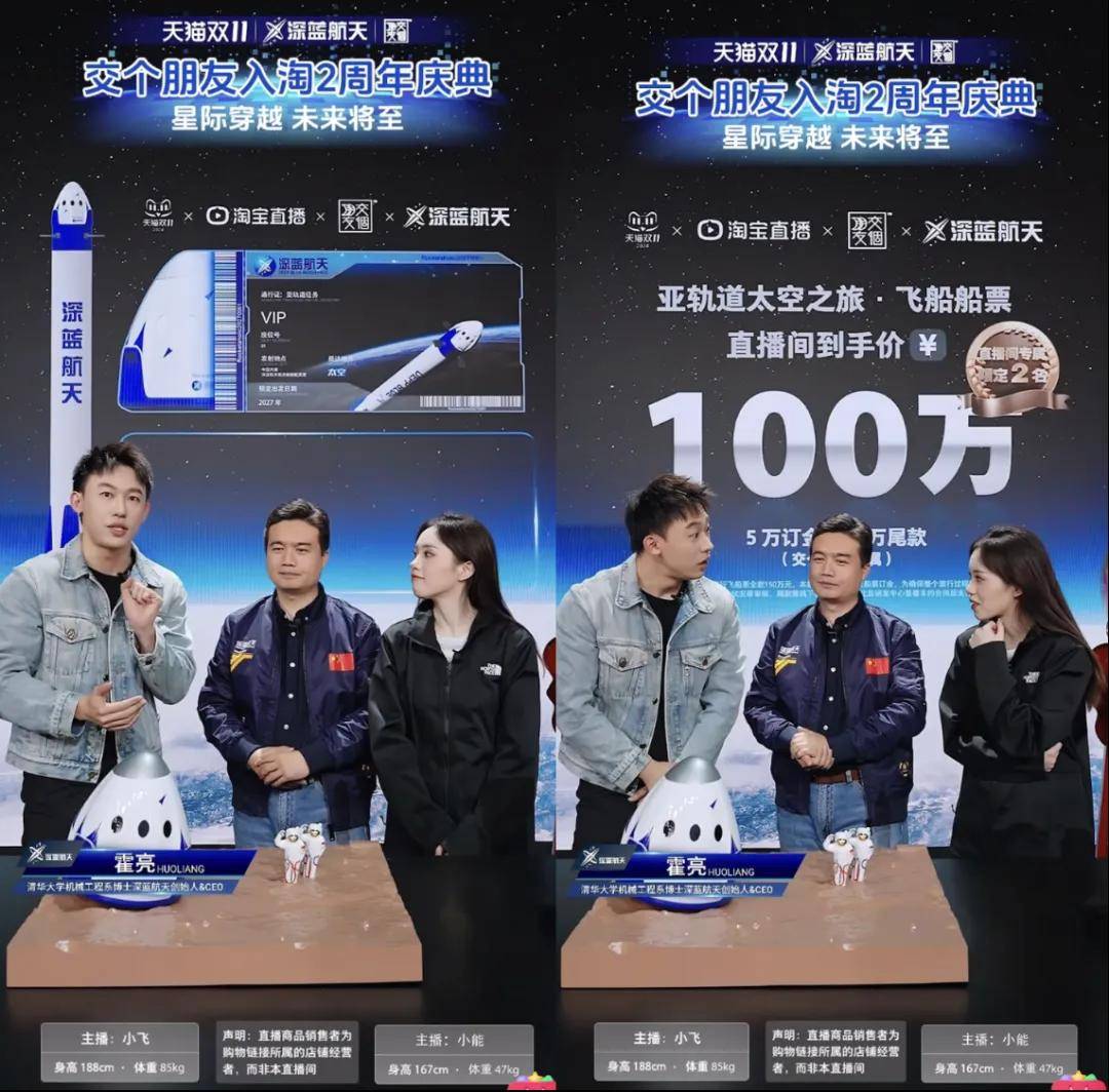今年雙11,交個朋友迎來“入淘”兩周年紀(jì)念日。晚上6點,交個朋友淘寶直播間買起了“太空旅行船票”,聯(lián)合深藍航天在國內(nèi)推出2027年亞軌道旅行的2個飛船坐席,船票在4分鐘內(nèi)便被全部拍下,該場直播數(shù)據(jù)累計觀看人次突破800萬,總銷售額達到3000萬元。