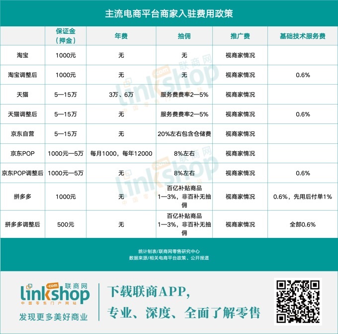 和阿里一樣,去年4月起,針對(duì)POP商家,京東取消平臺(tái)使用費(fèi)(一年12000元),改為0.6%交易服務(wù)費(fèi)。
