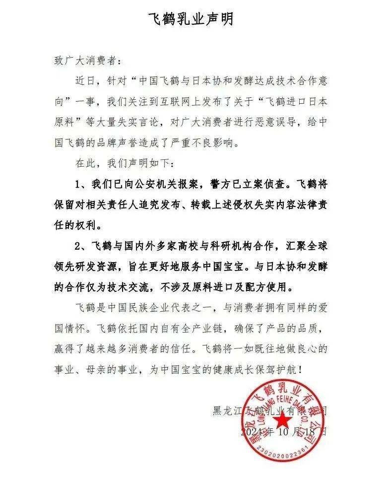 2024年10月18日,飛鶴乳業(yè)發(fā)布公告稱,互聯(lián)網(wǎng)上關(guān)于“飛鶴進(jìn)口日本原料”等大量失實言論,對廣大消費(fèi)者進(jìn)行惡意誤導(dǎo),給飛鶴的品牌聲譽(yù)造成了嚴(yán)重不良影響。