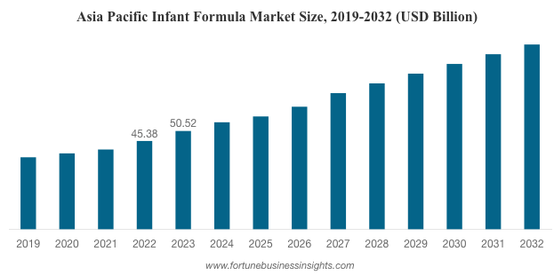 Business Insights披露的數(shù)據(jù)顯示,2023年,全球嬰兒配方奶粉市場規(guī)模為738.3億美元。預(yù)計2024年—2032年,相關(guān)市場規(guī)模將從817.2億美元增長到1788.3億美元,復(fù)合年增長高達(dá)10.28%。顯而易見,全球嬰兒配方奶粉市場還有一定的增量紅利可供飛鶴挖掘。