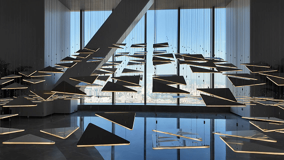 在這里,你可以感受科技之美,一上55樓,首先映入眼簾的是一個(gè)可以“流動(dòng)”的金屬裝置。裝置由182片金屬三角板組成,通過(guò)編程控制,金屬板會(huì)變成山川、火種、字母G等形狀。其中字母G有g(shù)reen、grow的意思,綠色、成長(zhǎng),也是這個(gè)科技場(chǎng)景的關(guān)鍵詞。