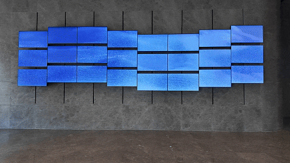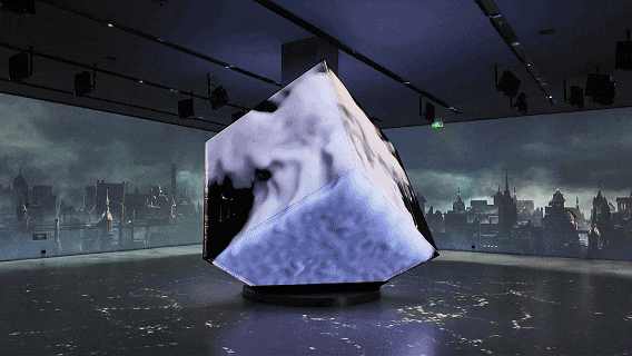 在裝置的旁邊,是一幅科技感滿滿的動(dòng)態(tài)浪潮畫(huà)卷。浪潮的流速、顏色無(wú)時(shí)無(wú)刻不在發(fā)生變化, 而影響這些的因素是金鷹大樓的電力數(shù)據(jù)、客流量等。這些數(shù)據(jù)通過(guò)編程設(shè)計(jì),結(jié)合24塊機(jī)械滑軌屏,給我們呈現(xiàn)了最終的視覺(jué)效果。往里走,有一個(gè)沉浸式裸眼3D劇場(chǎng),整個(gè)空間內(nèi)共有62臺(tái)全息投影機(jī)。