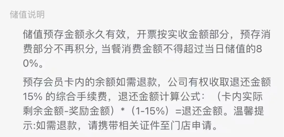 充值了會員卡的消費者卡內(nèi)余額有幾百到幾千不等。同時,根據(jù)消費者提供的截圖信息,預(yù)存會員卡內(nèi)的余額如需退款,公司有權(quán)收取15%的綜合手續(xù)費,并要求攜帶相關(guān)證件至門店申請方能辦理退款手續(xù)。
