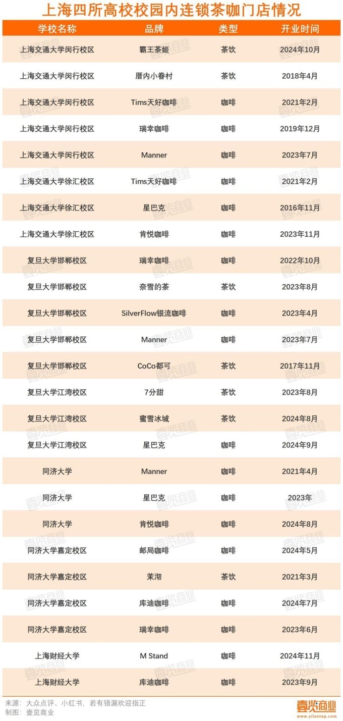 二是品牌想要進入校園,花費的金錢和資源并不少,隨著特殊點位“走紅”,這類成本往后只會越來越高。而且,競爭對手也能夠?qū)㈤T店開進校園,校園內(nèi)的競爭也會不斷加劇。僅上海交通大學(xué)閔行校區(qū)內(nèi),就有至少5家連鎖茶咖品牌,加上獨立品牌以及便利店咖啡,就有超10家門店。