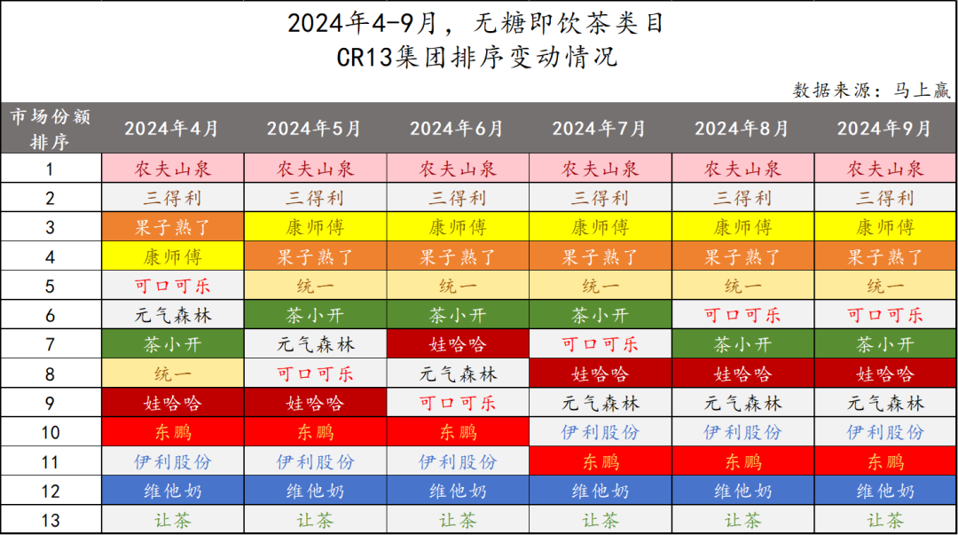 根據(jù)馬上贏數(shù)據(jù)顯示,縱觀整個2024年4-9月的,前13名集團(tuán)排名變化,可以看到:除了頭部的農(nóng)夫山泉和三得利之外,名次的變化在3-11位之間發(fā)生了劇烈的波動。3、4名的康師傅、果子熟了有短暫換位,但在5月以后康師傅還是穩(wěn)定在第三名的位置上。值得關(guān)注的是,統(tǒng)一上升較快,從4月的市場份額第八名,到5-9月持續(xù)穩(wěn)定在第五名的位置,是進(jìn)展較為穩(wěn)定的集團(tuán)之一。