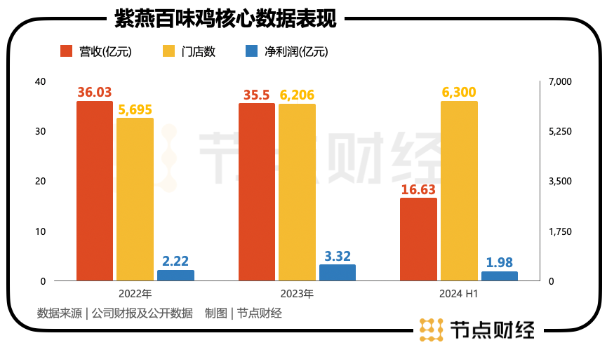 據(jù)《節(jié)點財經(jīng)》計算,紫燕食品的全國門店數(shù)分別在2023年以及2024年上半年增長超500/100家,但門店增長并未帶動營收增長,哪怕是在絕味食品、周黑鴨同時營收回暖的2023年,紫燕食品當年營收仍然相比2022年減少了0.53億元。
