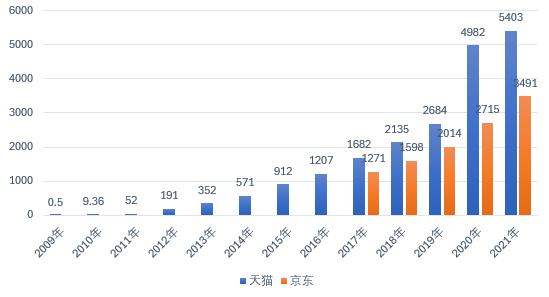 圖1:2009~2021年天貓、京東雙11銷售額(億元) 資料來源:根據(jù)網(wǎng)絡(luò)公開資料整理