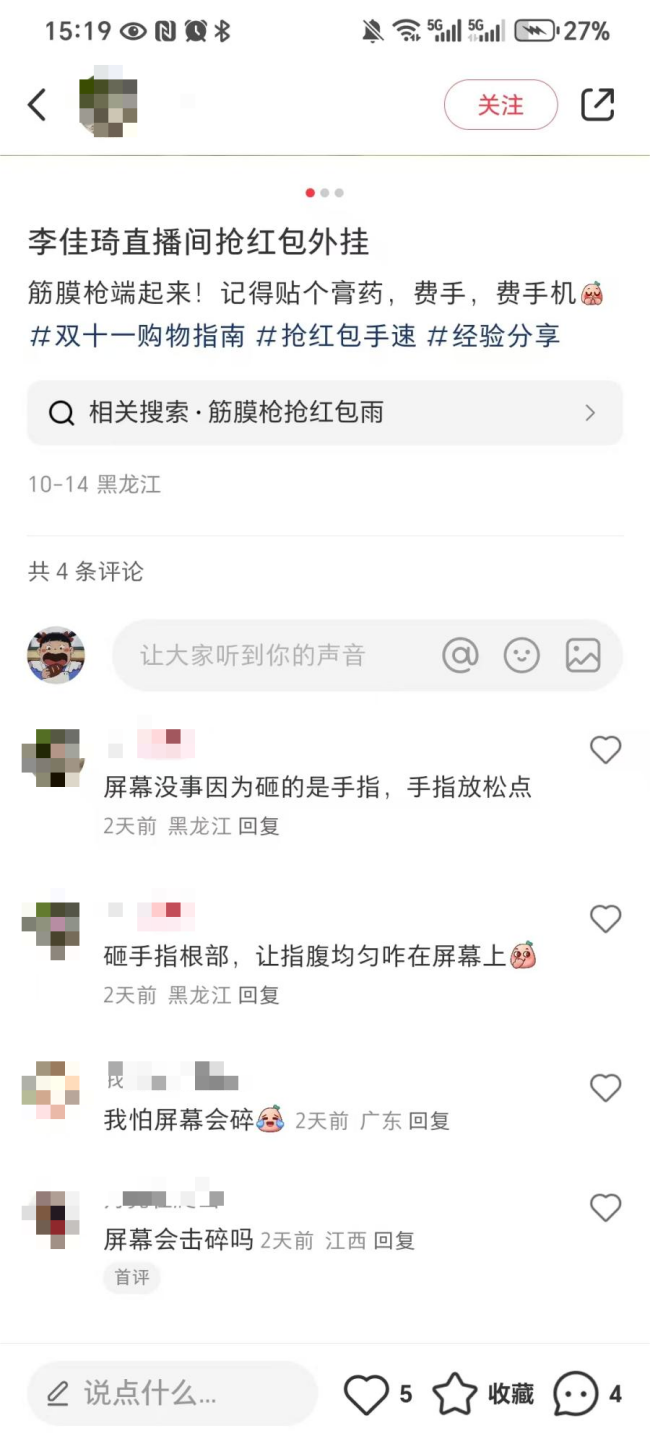 有用戶(hù)分享了“李佳琦直播間搶紅包外掛-筋膜槍”的攻略,本以為是在玩“抽象”,結(jié)果評(píng)論區(qū)有人真情實(shí)感的詢(xún)問(wèn)屏幕是否會(huì)碎,看來(lái)這群“攻略黨”真的是無(wú)所不用其極啊。