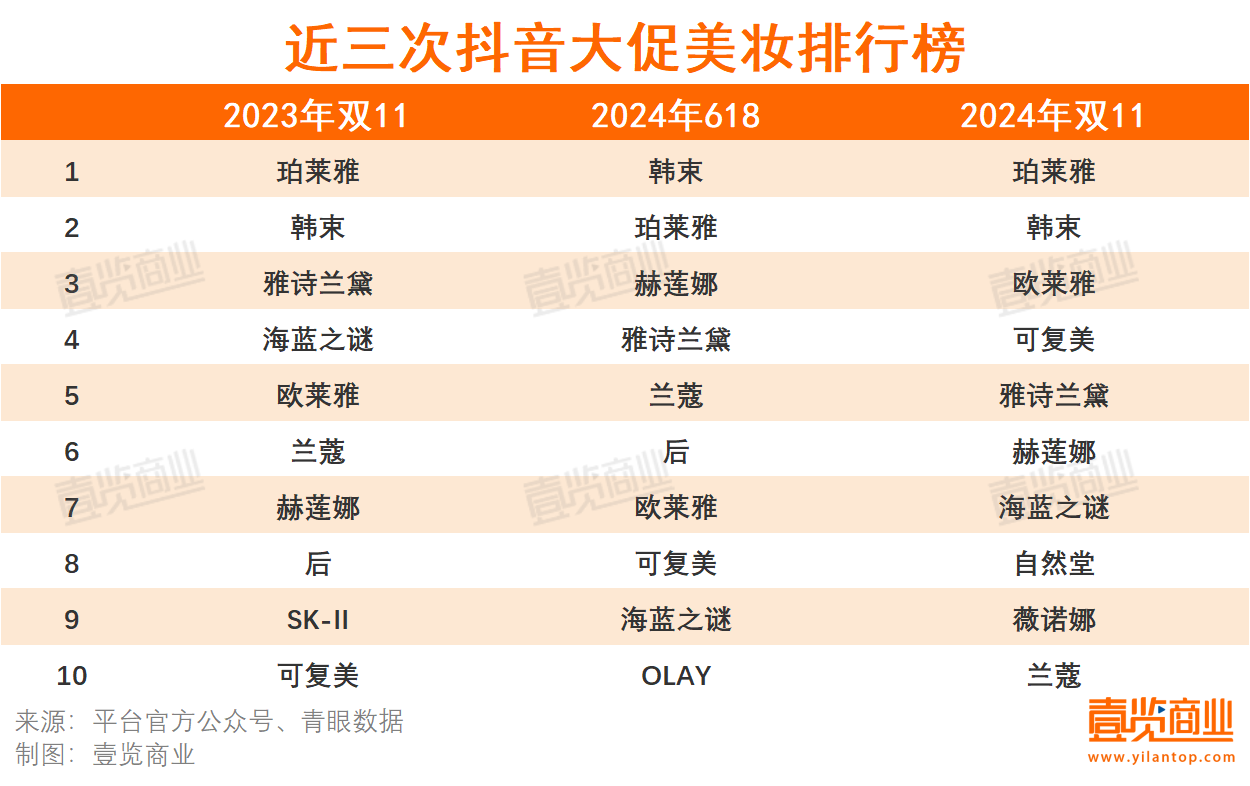 今年雙11全周期,天貓大美妝發(fā)布了多份行業(yè)榜單,抖音也首次發(fā)布官方半程榜單。總體來看,前10格局穩(wěn)定,日系品牌重新上榜。