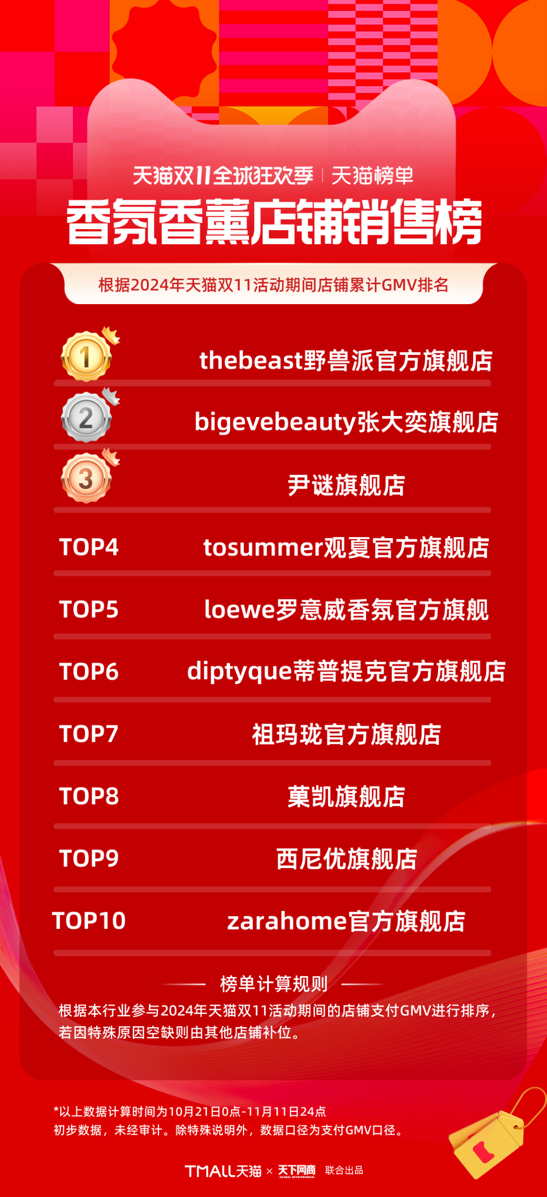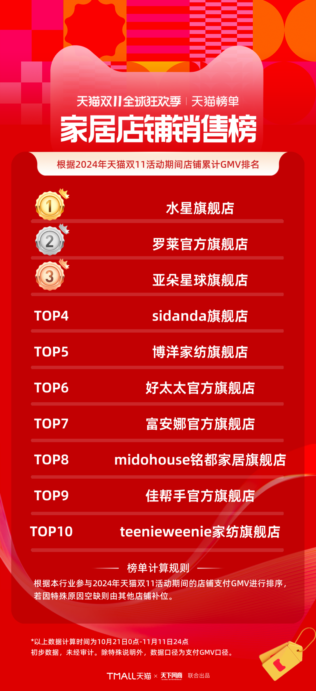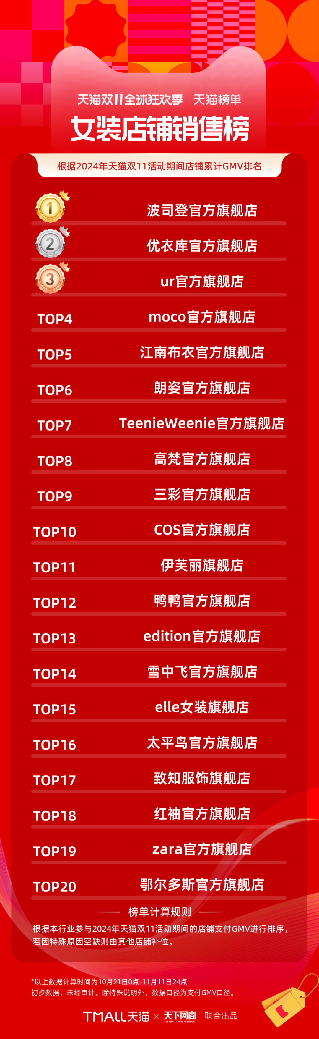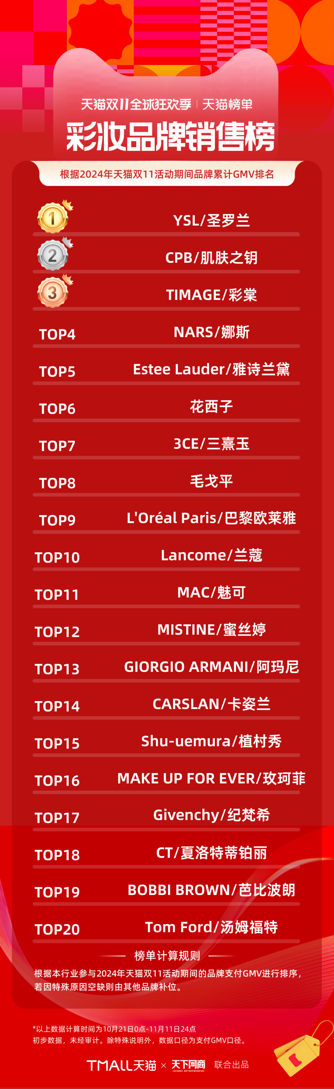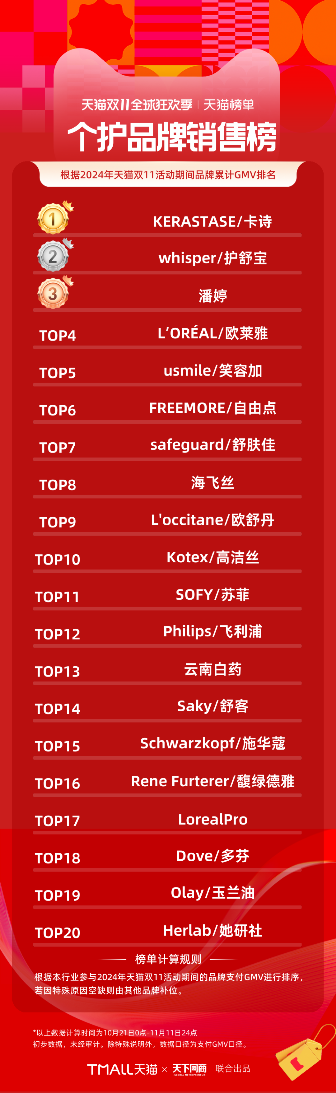 以下為《天下網(wǎng)商》聯(lián)合天貓發(fā)布的2024年天貓雙11全周期(10月21日-11月11日)品牌成交排行榜。