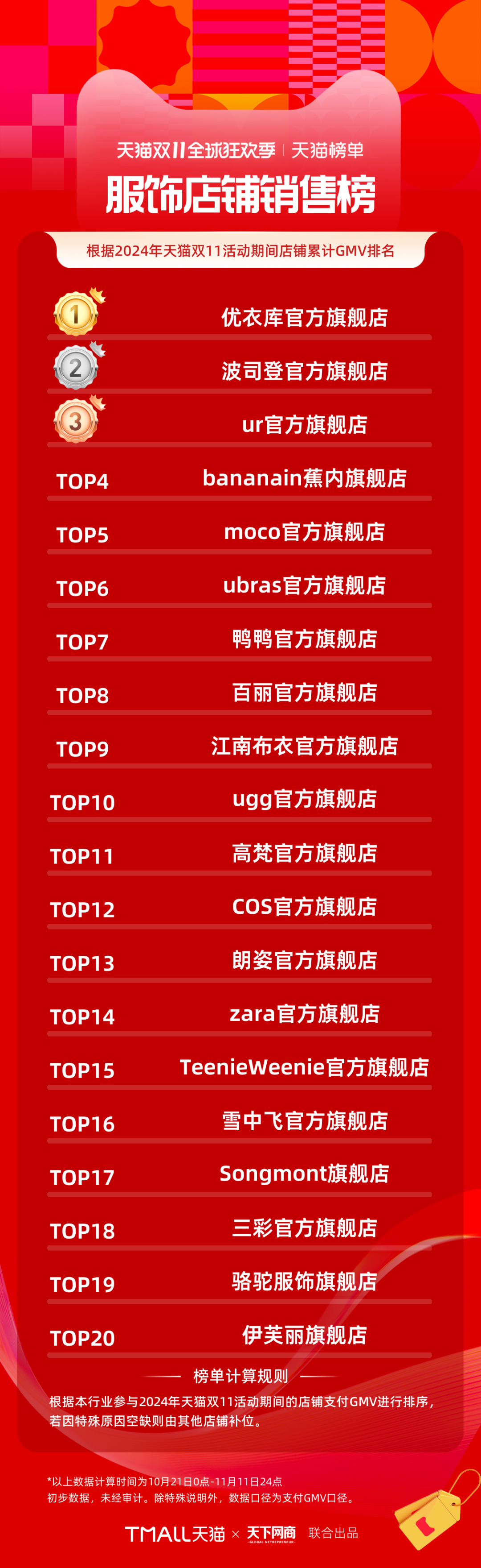 服飾品牌天貓雙11排行榜中,優(yōu)衣庫、波司登、UR拿下服飾店鋪銷售榜前三;moco排名提升5位成為Top5;江南布衣、UGG今年新上榜,躋身十強(qiáng)。