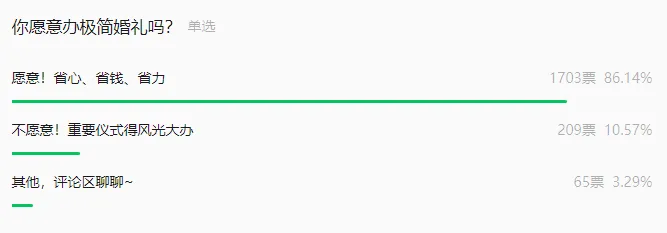 從央廣網(wǎng)發(fā)起的一則投票結(jié)果也可以看出,有超八成的年輕人表示愿意辦一場省心、省錢、省力的極簡婚禮,更注重的是婚禮所提供的情緒體驗(yàn)。