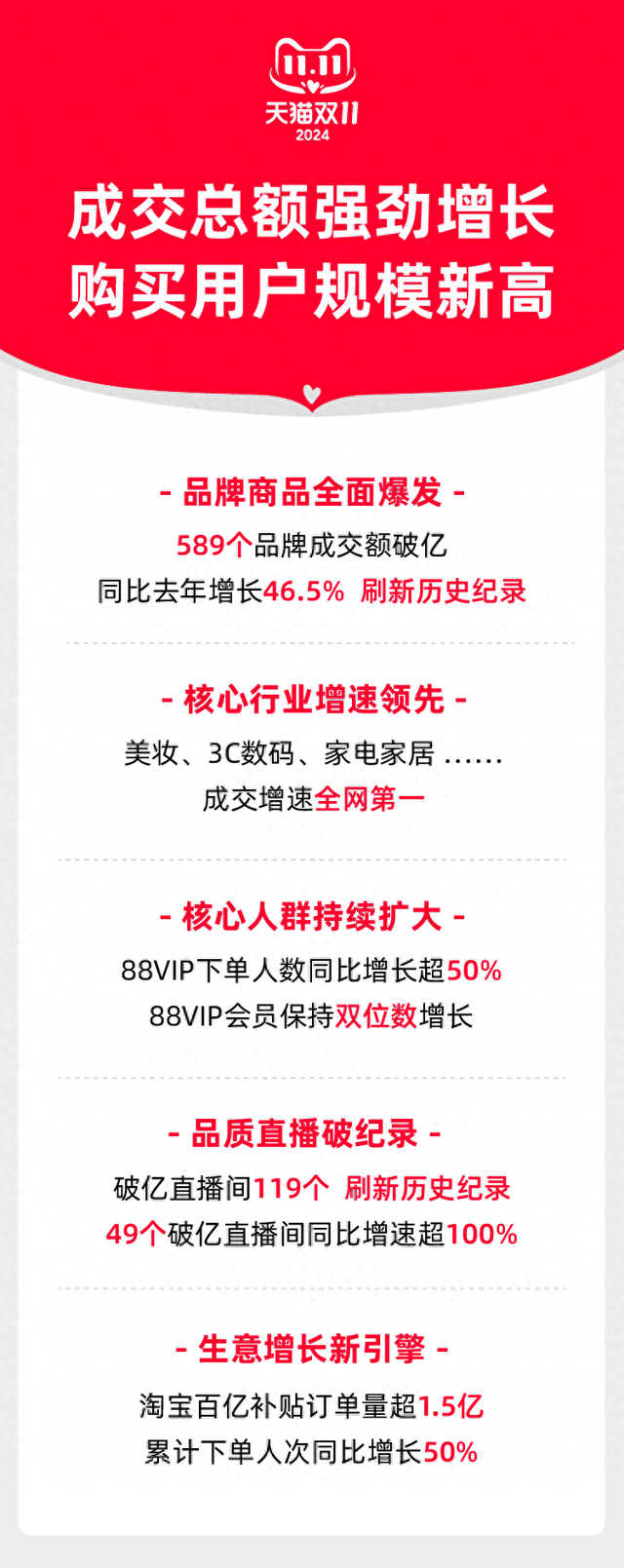 天貓雙11在11月11日24點收官,天貓雙11全周期,589個品牌成交額破億,同比去年增長46.5%,購買用戶規(guī)模創(chuàng)新高。