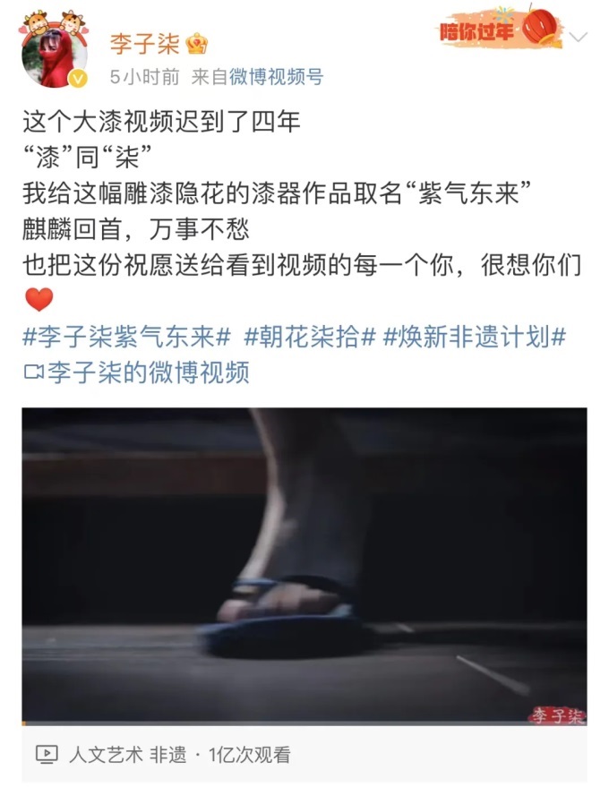 據悉,李子柒此次更新的視頻名為《雕漆隱花,雕出紫氣東來》,并稱這個大漆視頻遲到了四年,“漆”同“柒”,她給這幅雕漆隱花的漆器作品取名“紫氣東來”。
