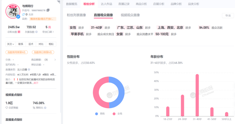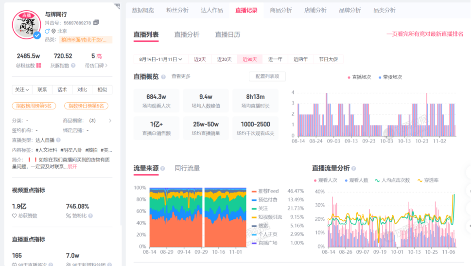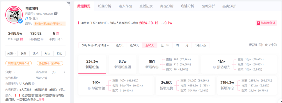 據(jù)統(tǒng)計(jì),與輝同行近90天內(nèi)帶貨銷售額超10億元,賬號(hào)粉絲漲了約234.3萬。同時(shí),與輝同行的抖音賬號(hào)粉絲已達(dá)2485.5萬,與東方甄選的2936.9萬相比,追趕勢(shì)頭十分迅猛。