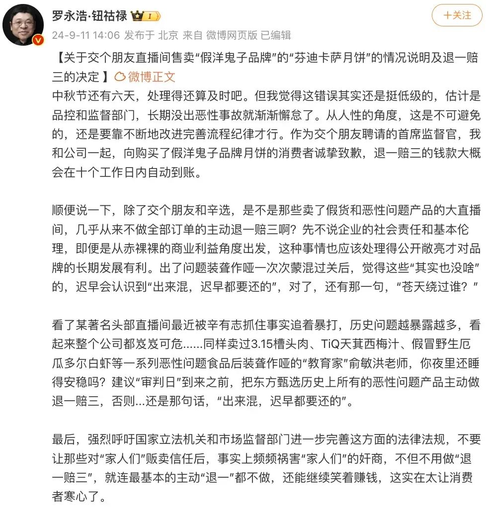 在9月份,羅永浩帶貨的“FENDI CASA月餅伴手禮”,也被曝出與奢侈品品牌“FENDI”存在品牌關聯(lián)性、涉嫌造假。事件爆發(fā)后,“交個朋友”決定給予購買月餅的用戶“退一賠三”的補償。