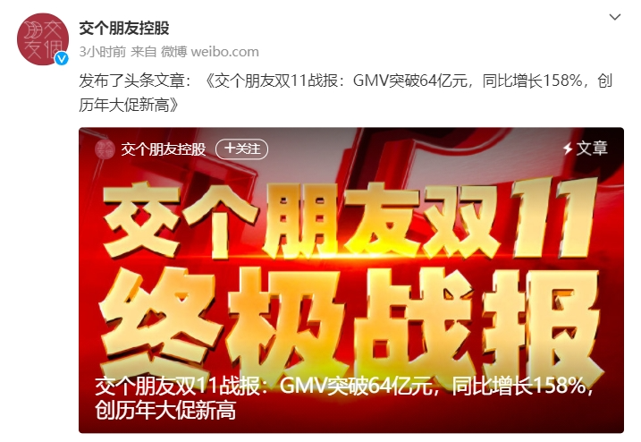 值得一提的是,在近期超頭主播頻繁“帶貨翻車”的背景下,今年“雙11”淘寶直播整體成交金額、購買用戶數(shù)均實現(xiàn)大幅度同比增長。“趣解商業(yè)”觀察到,“交個朋友”是此次為數(shù)不多仍在發(fā)布戰(zhàn)報的頭部MCN機構(gòu)。