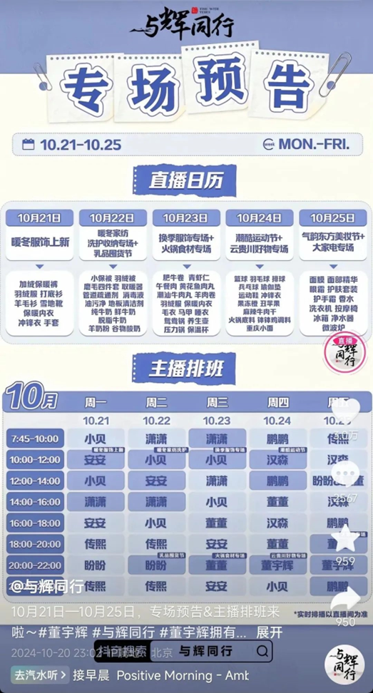 2024年10月14日-10月20日雙11開幕沖刺期,董宇輝僅直播兩次,累計(jì)直播四小時。10月21日-25日,董宇輝依然僅直播四小時。