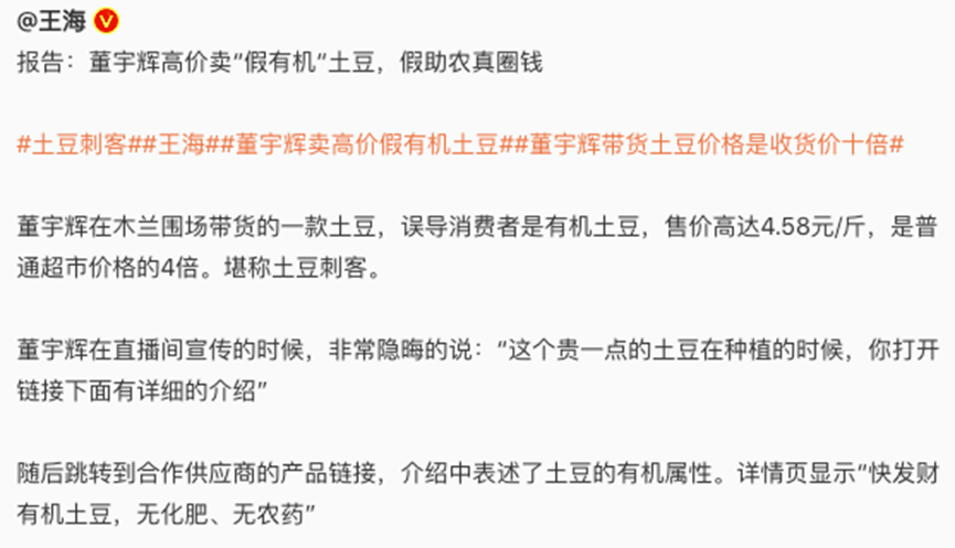 10月22日,打假博主王海發(fā)文稱,董宇輝在木蘭圍場帶貨的一款土豆,誤導(dǎo)消費(fèi)者是有機(jī)土豆,售價4.58元/斤,是普通超市價格的四倍,堪稱“土豆刺客”。隨后,董宇輝成為眾矢之的。