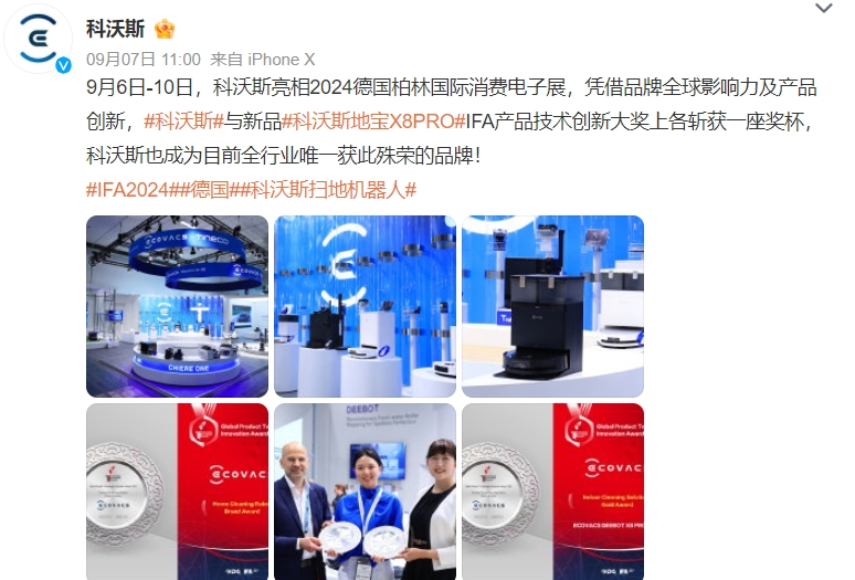 今年9月,科沃斯在2024德國(guó)柏林國(guó)際消費(fèi)電子展(IFA)高調(diào)發(fā)布“全球首款恒壓活水掃地機(jī)器人”地寶X8 PRO PLUS,其搭載全球首創(chuàng)的 OZMO 恒壓活水洗地系統(tǒng),采用噴淋、轉(zhuǎn)洗、刮擠、回收將臟污水刮走,實(shí)現(xiàn)活水循環(huán)。憑借著這一創(chuàng)新的技術(shù)產(chǎn)品,科沃斯也斬獲了“家庭清潔機(jī)器人品牌獎(jiǎng)”、“家居清潔解決方案金獎(jiǎng)”兩項(xiàng)2024 IFA產(chǎn)品技術(shù)創(chuàng)新大獎(jiǎng)。