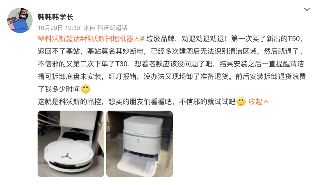社媒平臺(tái)上,網(wǎng)友對(duì)科沃斯和添可產(chǎn)品的吐槽也是層出不窮;甚至有很多網(wǎng)友發(fā)“勸退帖”,還有網(wǎng)友吐槽稱“三四千塊錢買了個(gè)爹!”