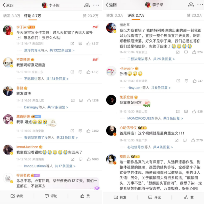 在長達1200多天的停更后,11月12日下午,李子柒微博賬號突然更新視頻,并發(fā)文稱:這個大漆視頻遲到了四年,“漆”同“柒”。我給這幅雕漆隱花的漆器作品取名“紫氣東來”,麒麟回首,萬事不愁,也把這份祝愿送給看到視頻的每一個你,很想你們。