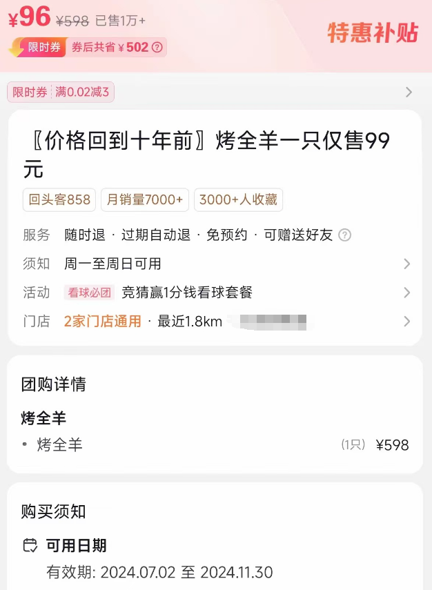 當然,就烤全羊這個聚餐熱門項目而言,500多元的秒殺價還不是最卷的。這個冬天,甚至已經(jīng)有門店直接將一只烤全羊的掛單價格秒殺至兩位數(shù),而該款商品眼下已售出超一萬單。