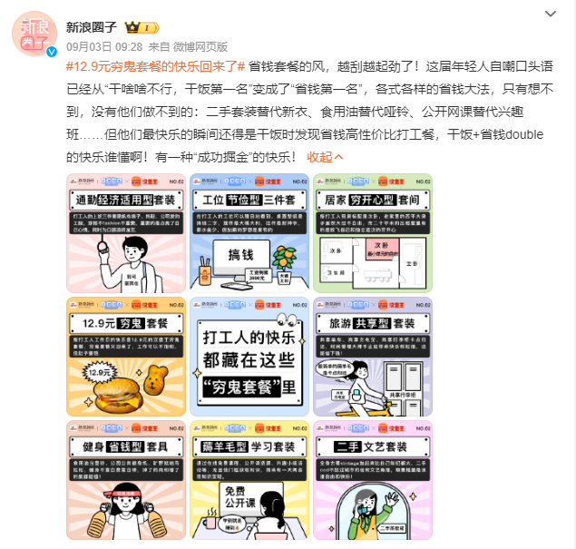 早上9.9元來一杯瑞幸,中午一頓13.9元任兩件隨心配,晚上八點半后去和大媽們搶購折扣商品,如此循環(huán)到周六,再花85元參加夕陽紅旅行團,周日則約上一兩好友用秒殺價觀影唱K……針對當代年輕人的吃喝玩樂,窮鬼套餐的風還是吹到了各個角落。