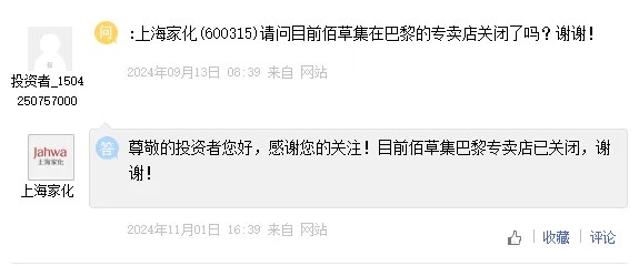 上海家化宣布佰草集巴黎專賣店關(guān)閉 圖源:上海證券市場(chǎng)溝通平臺(tái)上交e互動(dòng)