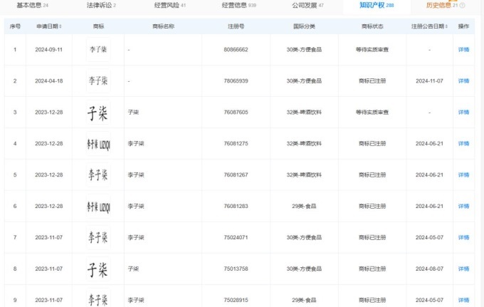一方面,此前李子柒和微念因“李子柒品牌”收益分成問題展開的爭議,已得到妥善解決。結(jié)合天眼查信息來看,杭州微念不再持有“李子柒”“柒”“子柒”三個品類商標。這些商標全部歸四川子柒文化傳播有限公司所持有,這家公司李子柒持股比例高達99%。簡單來說就是,李子柒對“李子柒”商標具有絕對的話語權(quán)。