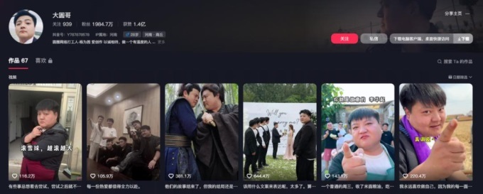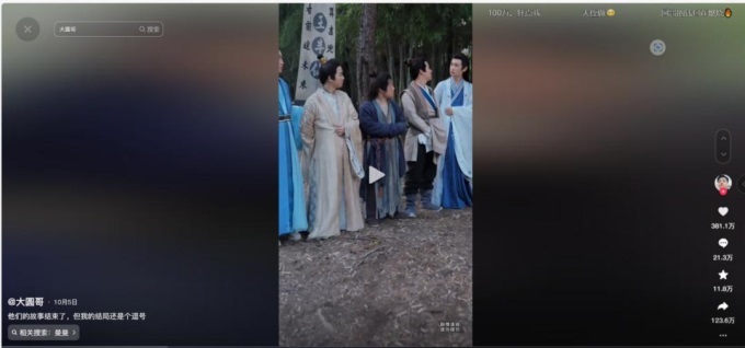 但@大圓哥高點贊視頻創(chuàng)作成本相對較高。如《他們的故事結(jié)束了,但我結(jié)局還是個逗號》,團隊從河南商丘到浙江橫店,來回差旅費用、橫店拍攝期間場地、化妝、武指費用、幾秒的無人機鏡頭拍攝費用等等,預(yù)估至少在20萬。