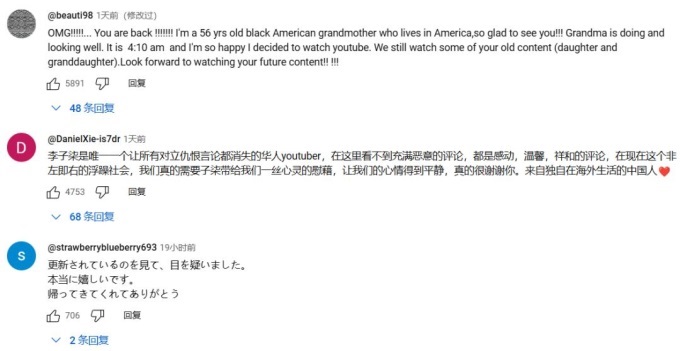 在YouTube平臺上,不同國家的網(wǎng)友用不同的語言,表達對李子柒的愛和支持。韓國網(wǎng)友表示:眼淚都出來了,等待了兩年,終于見到姐姐的影像。希望未來的十年二十年,我們一直一起變老。