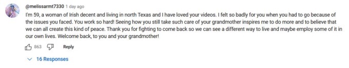 愛爾蘭網(wǎng)友表示:我非常喜歡你的視頻。當你因為遇到的問題不得不離開時,我為你感到難過。你真的很努力!看到你仍然如此用心地照顧你的奶奶,激勵我去做更多的事情,并讓我相信我們都可以創(chuàng)造這種平靜的生活。