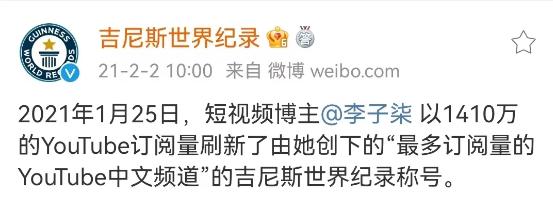 且李子柒在外網(wǎng)保持有著較大的影響力,其不僅以1410萬的YouTube訂閱量,刷新由她創(chuàng)下的“最多訂閱量的YouTube中文頻道”的吉尼斯世界紀錄稱號,而且在停更的三年多時間里,粉絲仍暴漲500萬。視頻更新后,李子柒的粉絲量已破2000萬。
