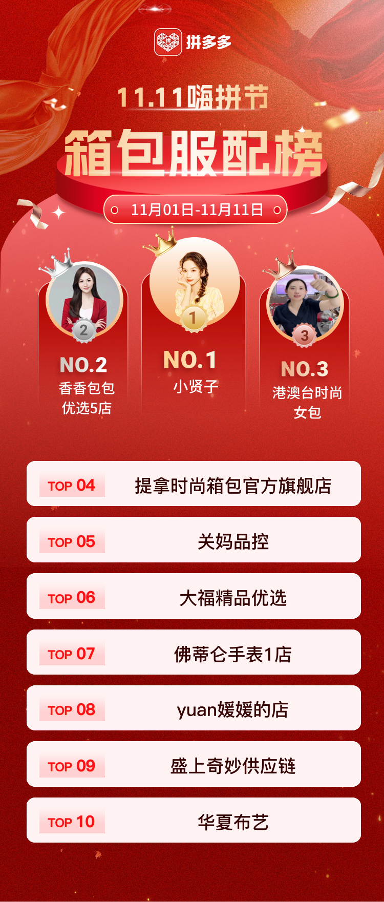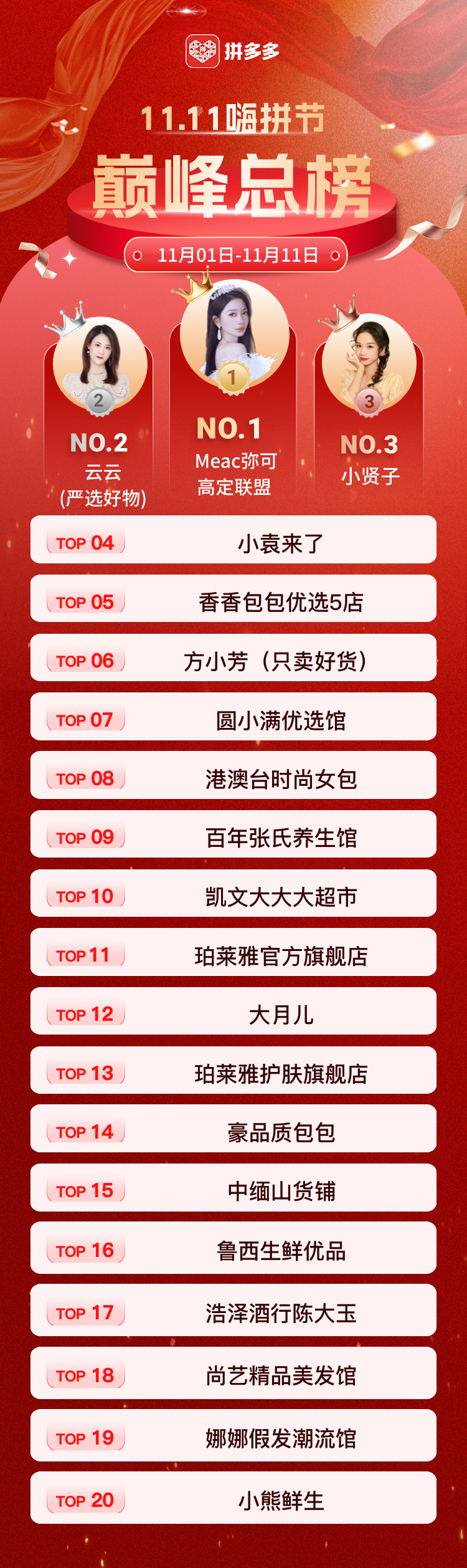 在今年官方曝光的雙11總榜前二十名中,多為拼多多的達人主播或白牌店鋪。