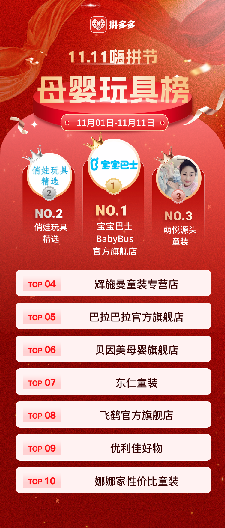 在母嬰玩具榜中,TOP3為寶寶巴士BabyBus官方旗艦店、俏娃玩具精選、萌悅源頭童裝。其中,寶寶巴士BabyBus官方旗艦店直播間在雙11期間的主打單品為一款單價大概300多元的點讀筆。而巴拉巴拉官方旗艦店位列拼多多直播雙11母嬰玩具榜第五。此外,貝因美母嬰旗艦店、飛鶴官方旗艦店分列榜單TOP6和TOP8。