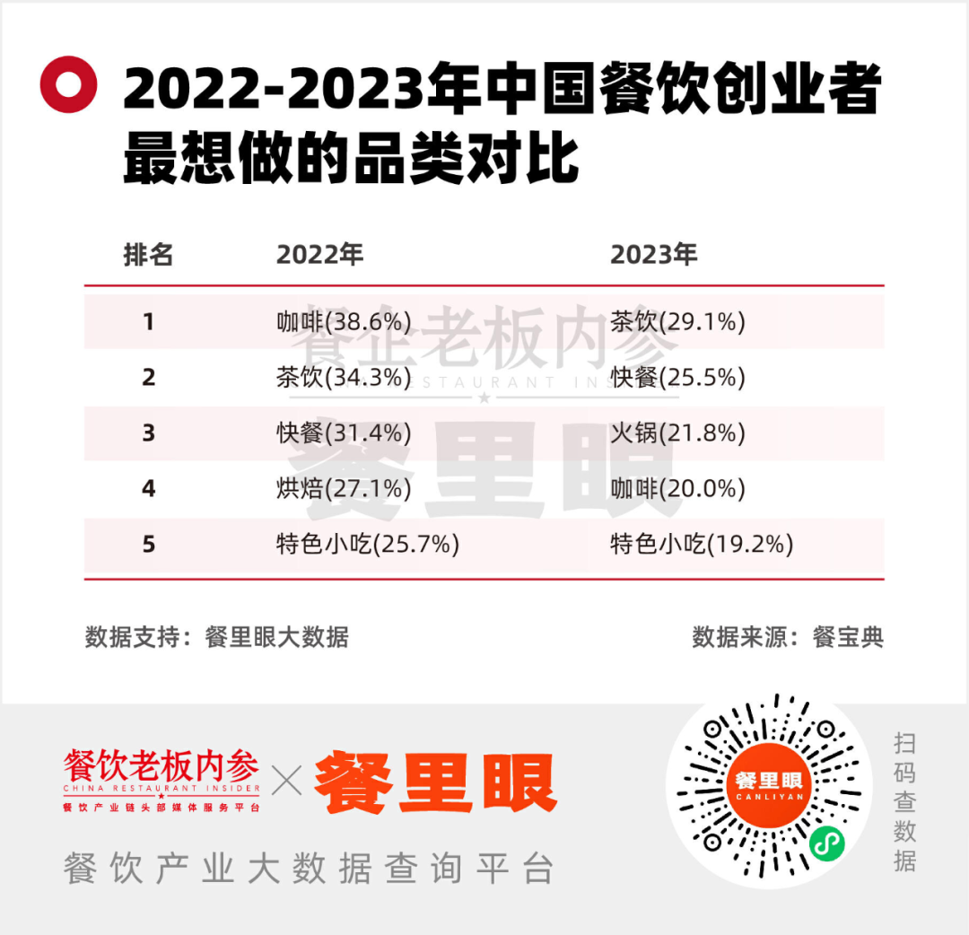 2022年,有34.3%的餐飲創(chuàng)業(yè)者最想做茶飲,盡管這一比例在2023年降至29.1%,但仍占比較高。
