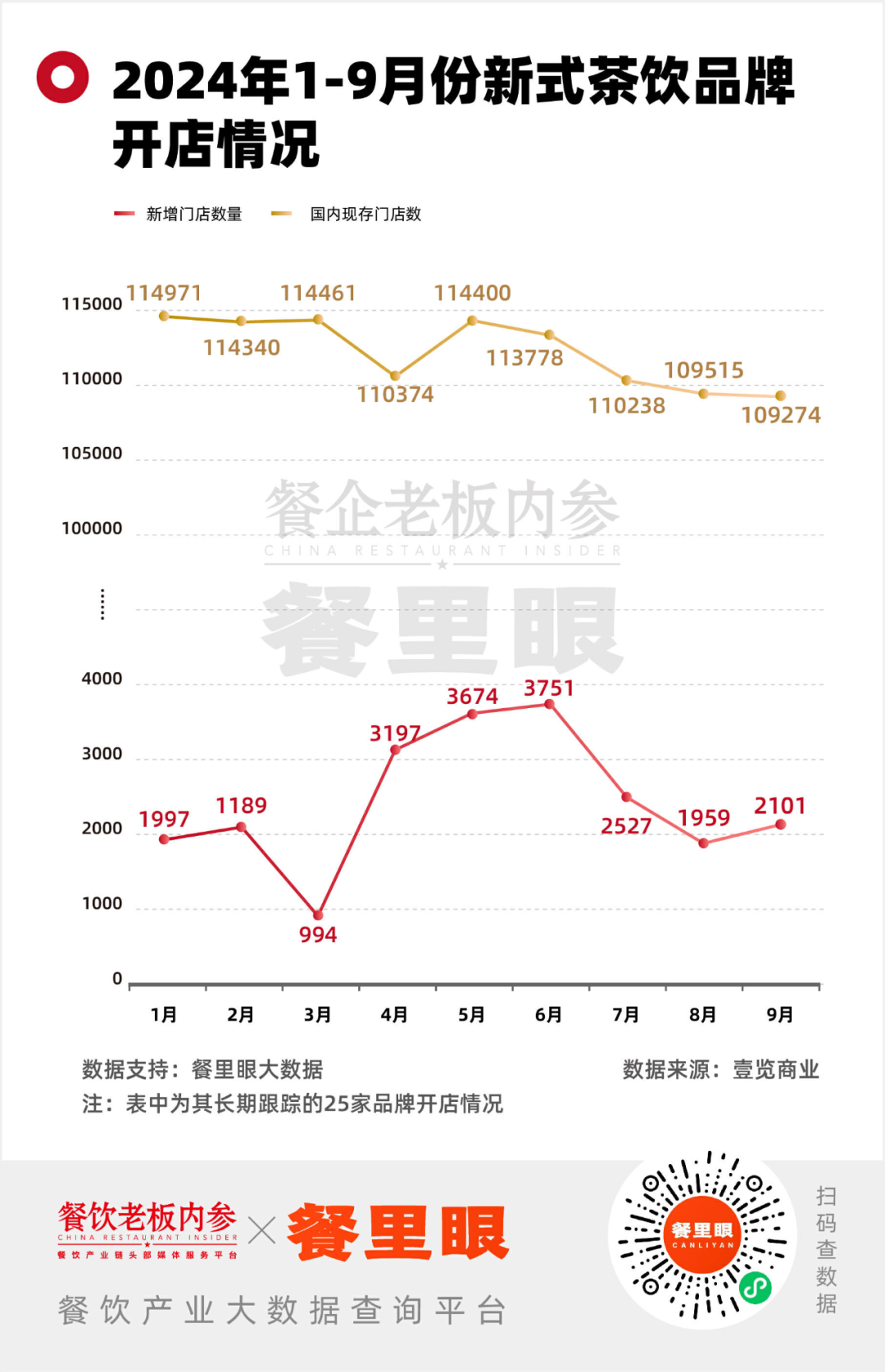 壹覽商業(yè)數據顯示,9月份,25家新茶飲連鎖品牌新開門店總量與上月相比增加288家,環(huán)比增長15.89%。但從現存門店數來看,今年5月份以來,茶飲行業(yè)整體門店數仍呈下降趨勢。