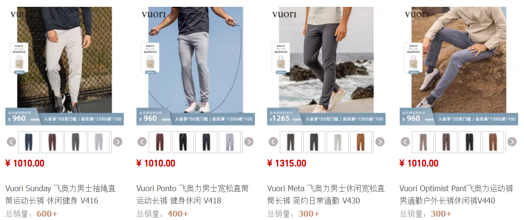 打開天貓旗艦店,Vuori產(chǎn)品在中國市場的大致定價在400至4000元不等,主打產(chǎn)品男士運動長褲價格大多在800至1300元左右,以千元價格線為主,與lululemon正在布局的男裝價格線相近。